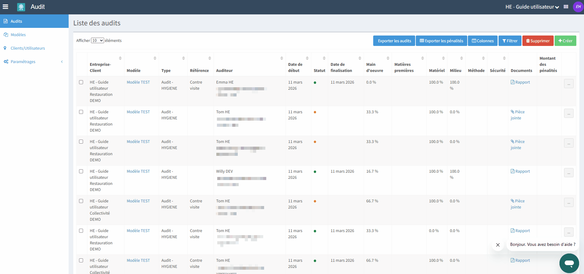 Vous ne retrouverez pas tous les audits. Selon le pays, le secteur, les groupes d'utilisateurs, le workflow de l'audit, vos rôles, etc. vous pourrez voir ou ne pas voir certains audits. Retrouvez ici toutes les règles de visibilité selon les workflows : Les différents workflows.