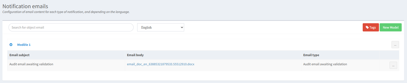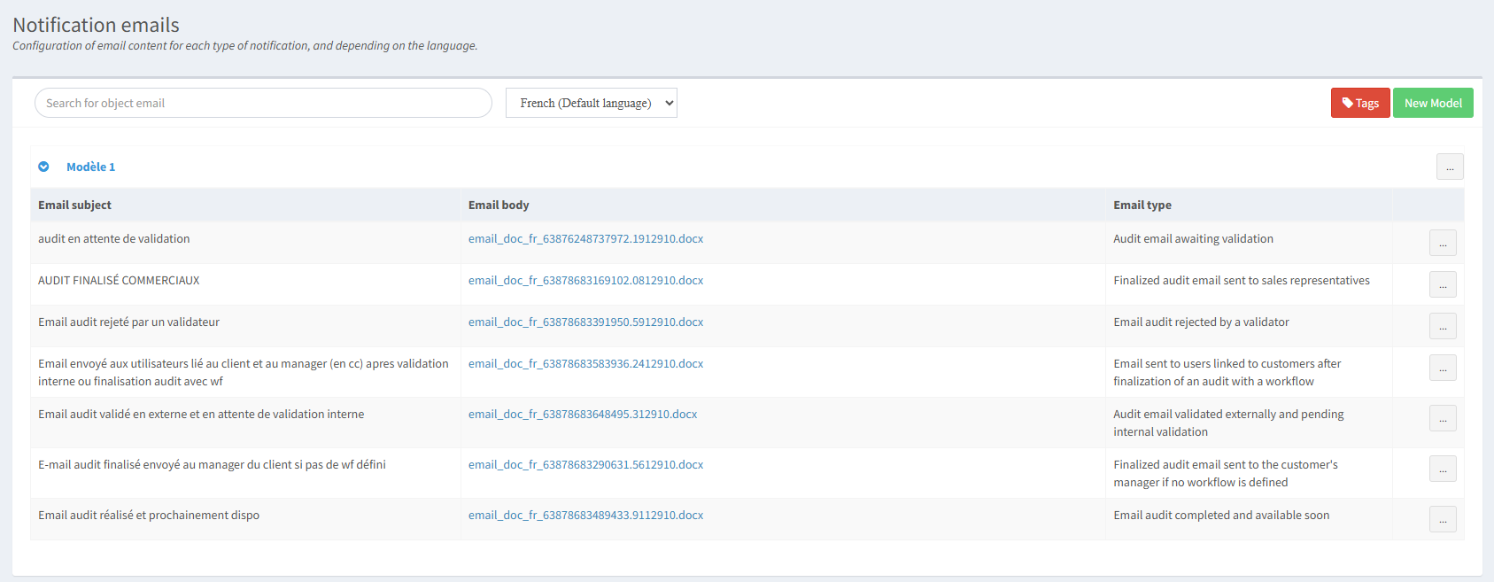 Dans ce cas, les mails sont en français par défaut. Seul le mail "en attente de validation" ("audit email awaiting validation") est traduit en anglais. Un utilisateur anglais (dans le Center) recevra donc ce mail en anglais mais les autres mails en français. Un utilisateur paramétré dans le center avec une autre langue (espagnol, portugais, danois...) recevra tous les mails en français car il s'agit de la langue paramétrée par défaut pour ce modèle et qu'aucune traduction n'est prévue pour leur langue.