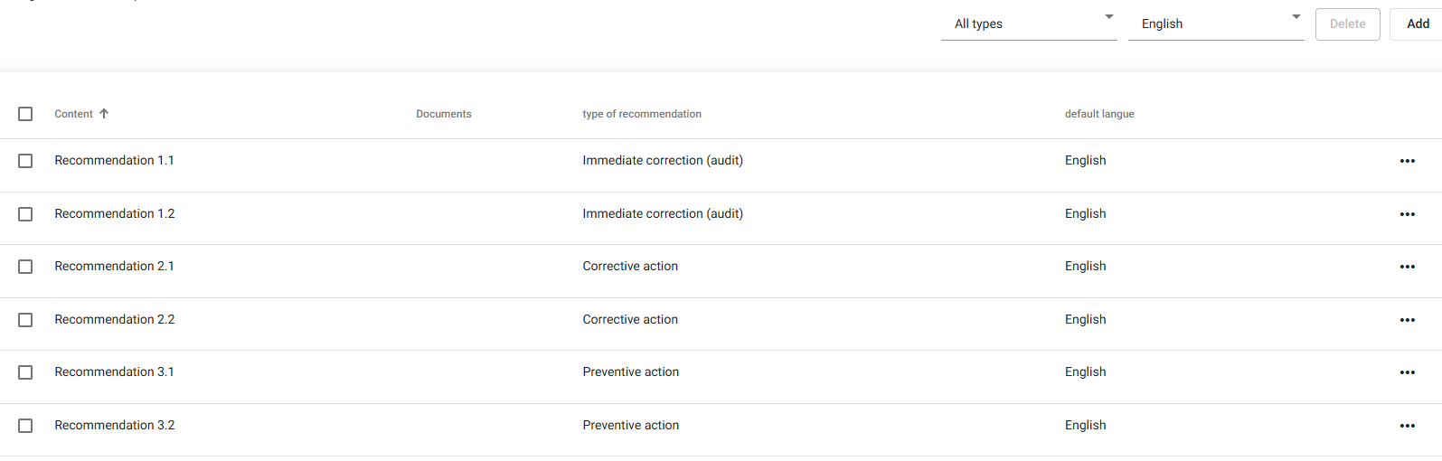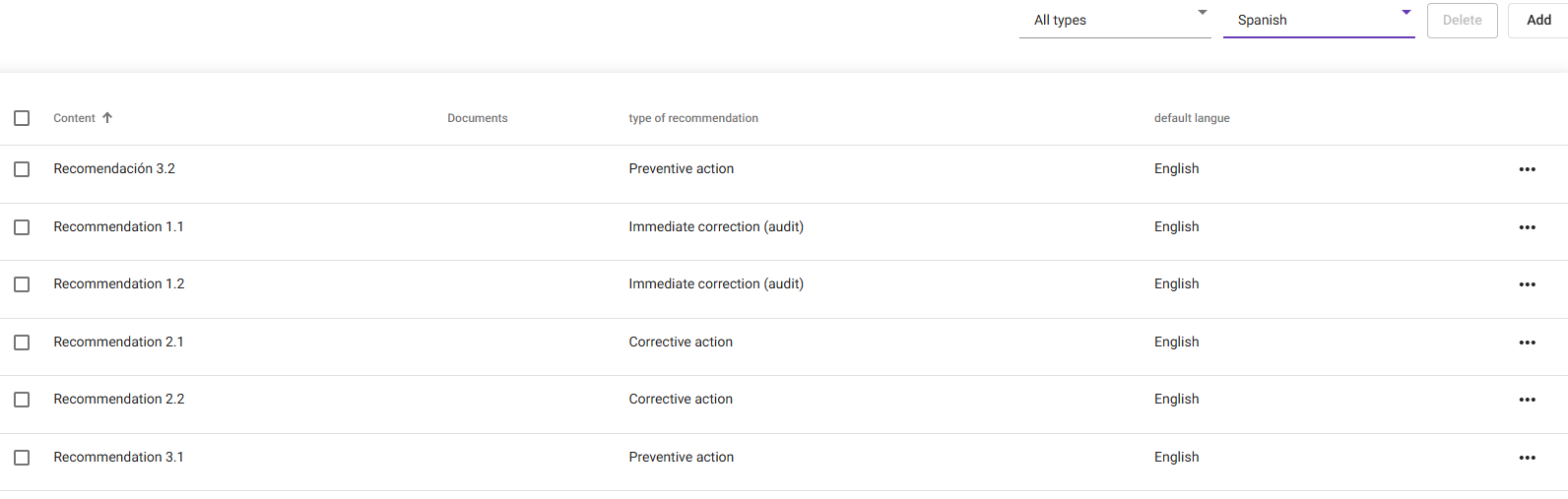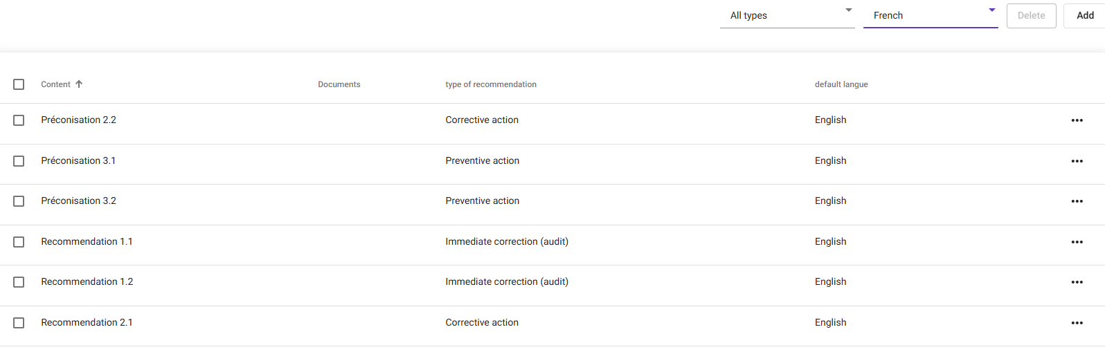Dans ce cas, les préconisations sont en anglais par défaut. Les préconisations 2.2, 3.1 et 3.2 ont été traduites en français. Un utilisateur français (dans le Center) verra donc ces préconisations en français mais les autres en anglais. La préconisation  3.2 a été traduite en espagnol. Un utilisateur espagnol (dans le Center) verra donc cette préconisation en espagnol mais les autres en anglais. Un utilisateur paramétré dans le center avec une autre langue (espagnol, portugais, danois...) recevra tous les mails en français car il s'agit de la langue paramétrée par défaut pour ce modèle et qu'aucune traduction n'est prévue pour leur langue.