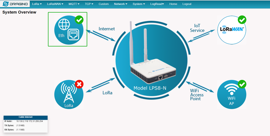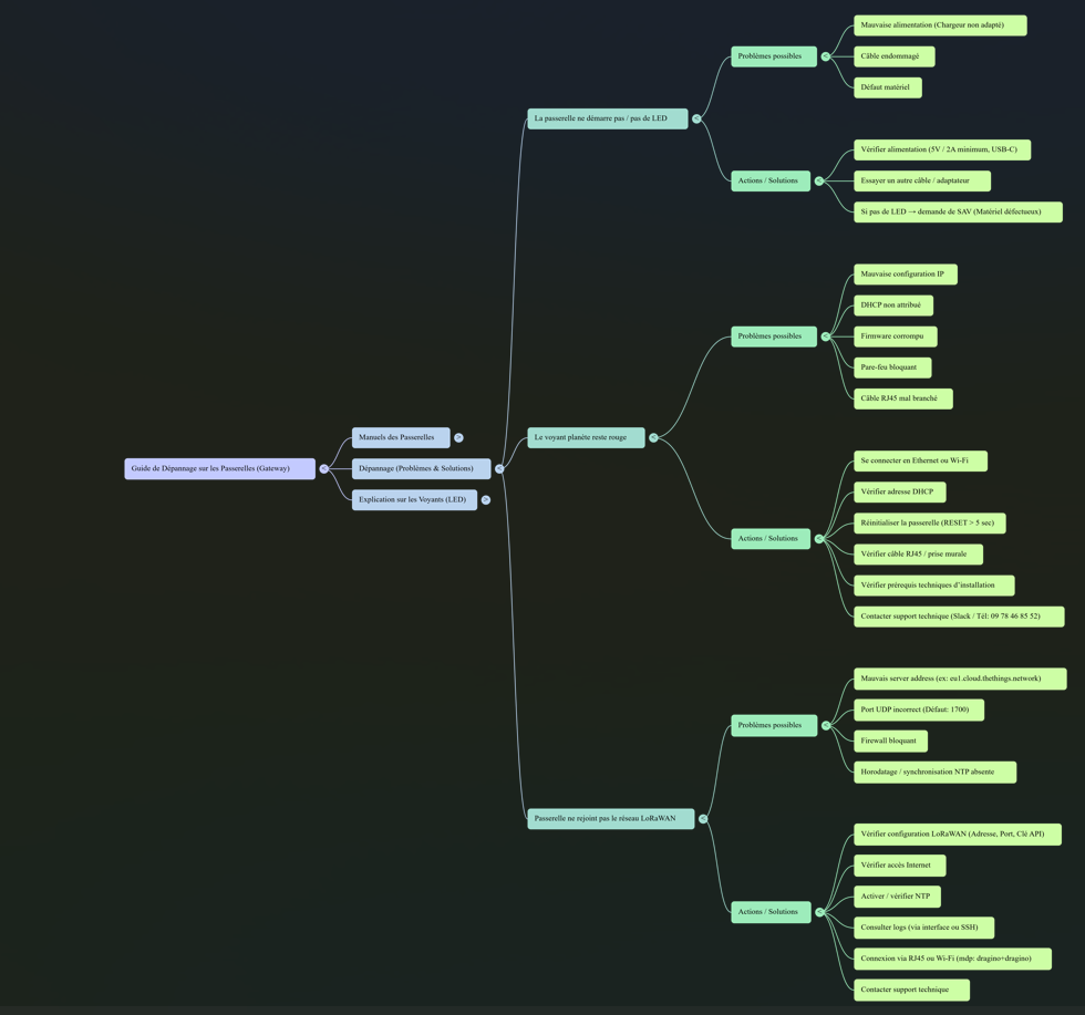 Passerelle non connectée au réseau LoRa | - Mauvais server address (ex: eu1.cloud.thethings.network) - Port UDP incorrect - Firewall bloquant - Horodatage / synchronisation NTP absente |