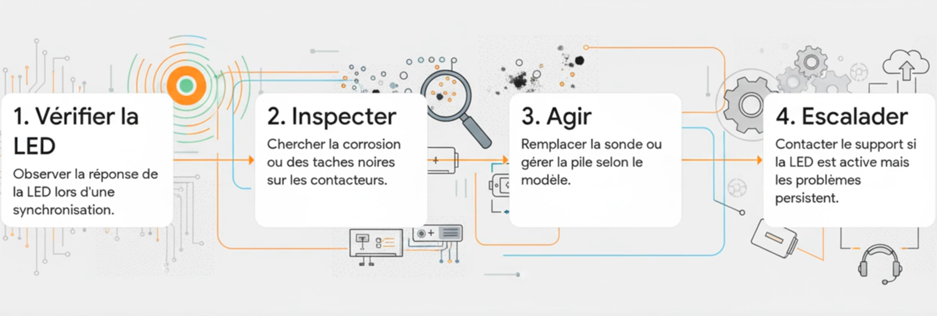 - Remplacement sonde si contacteurs endommagés - V1 : demande de SAV - V2 : commander pile via HE Connect - Contacter support si voyants OK mais que les problèmes persistent |